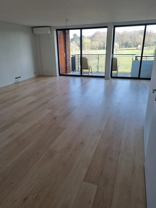 Deze maple houten vloer hebben we geschuurd en gelakt. De vloer is licht gebleven.